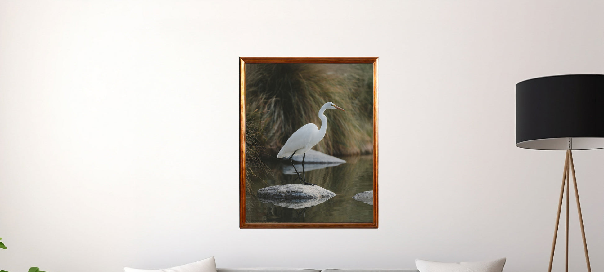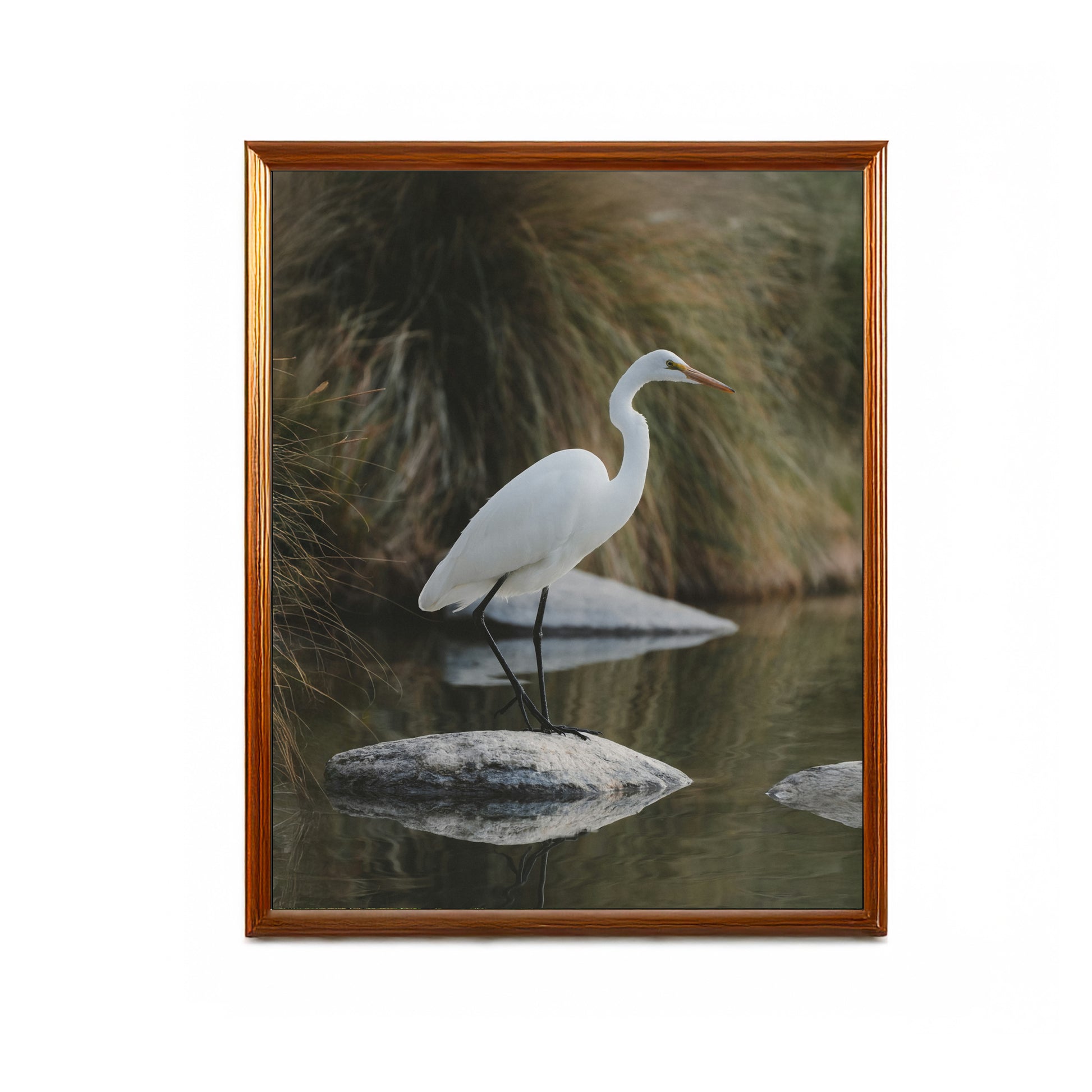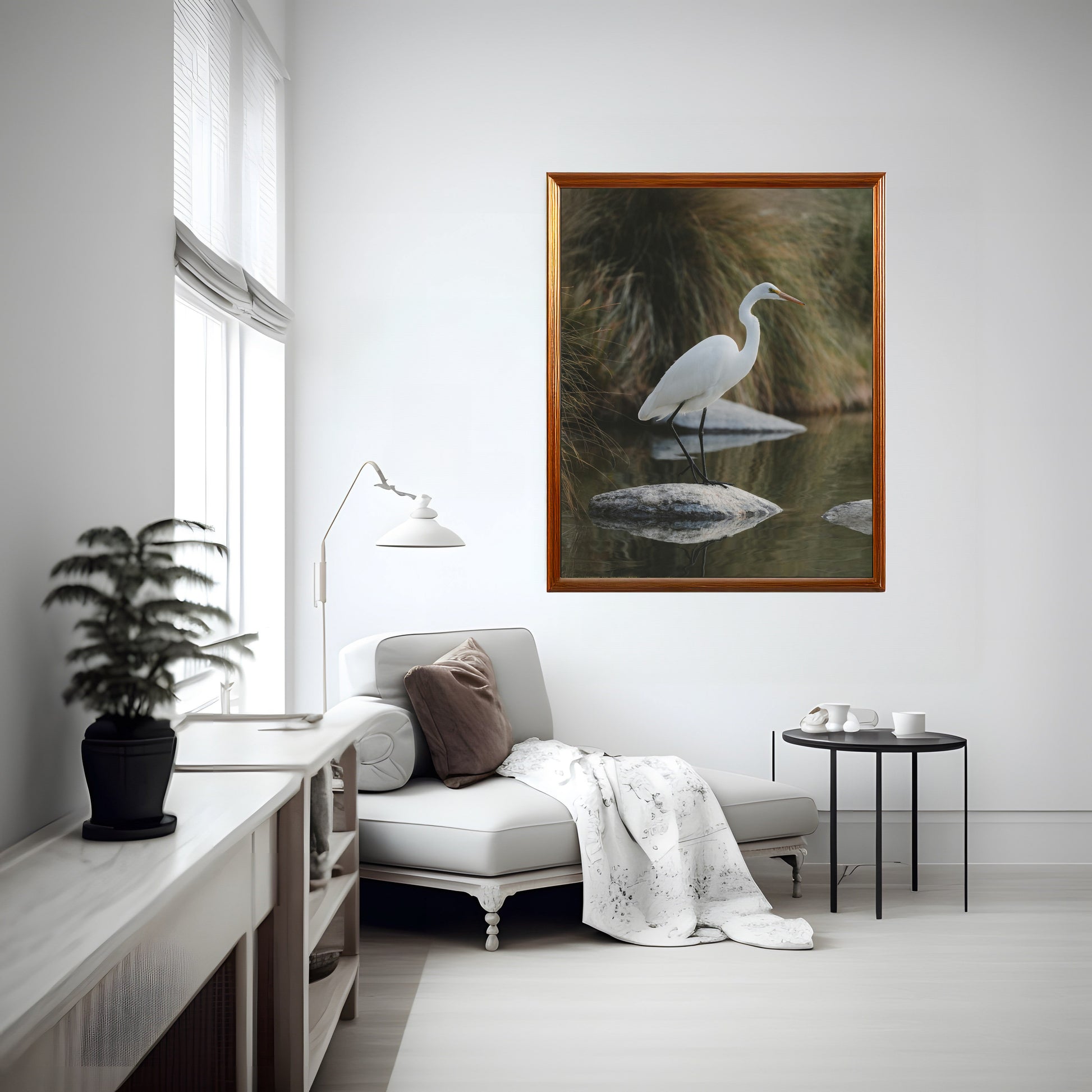 Capture the serene beauty of nature with this stunning artwork featuring a graceful egret standing on a rock amidst calm water. The bird, poised and elegant, blends perfectly with its tranquil surroundings, while the soft reflection in the water enhances the peaceful scene. In the background, lush grass completes the picturesque view, evoking a sense of harmony and quietude. Ideal for nature lovers, this peaceful piece brings the calm of the wild into your home, creating a soothing atmosphere.