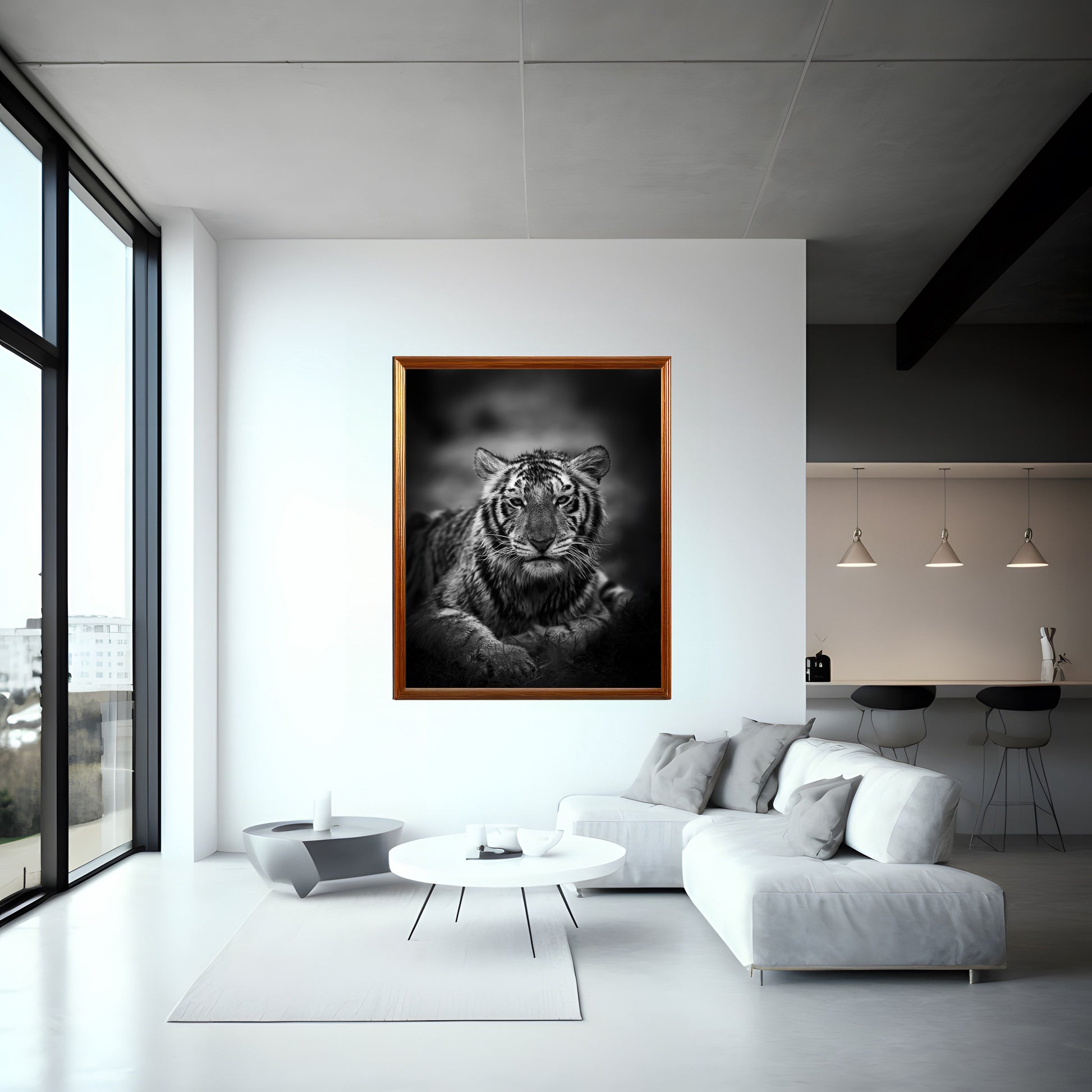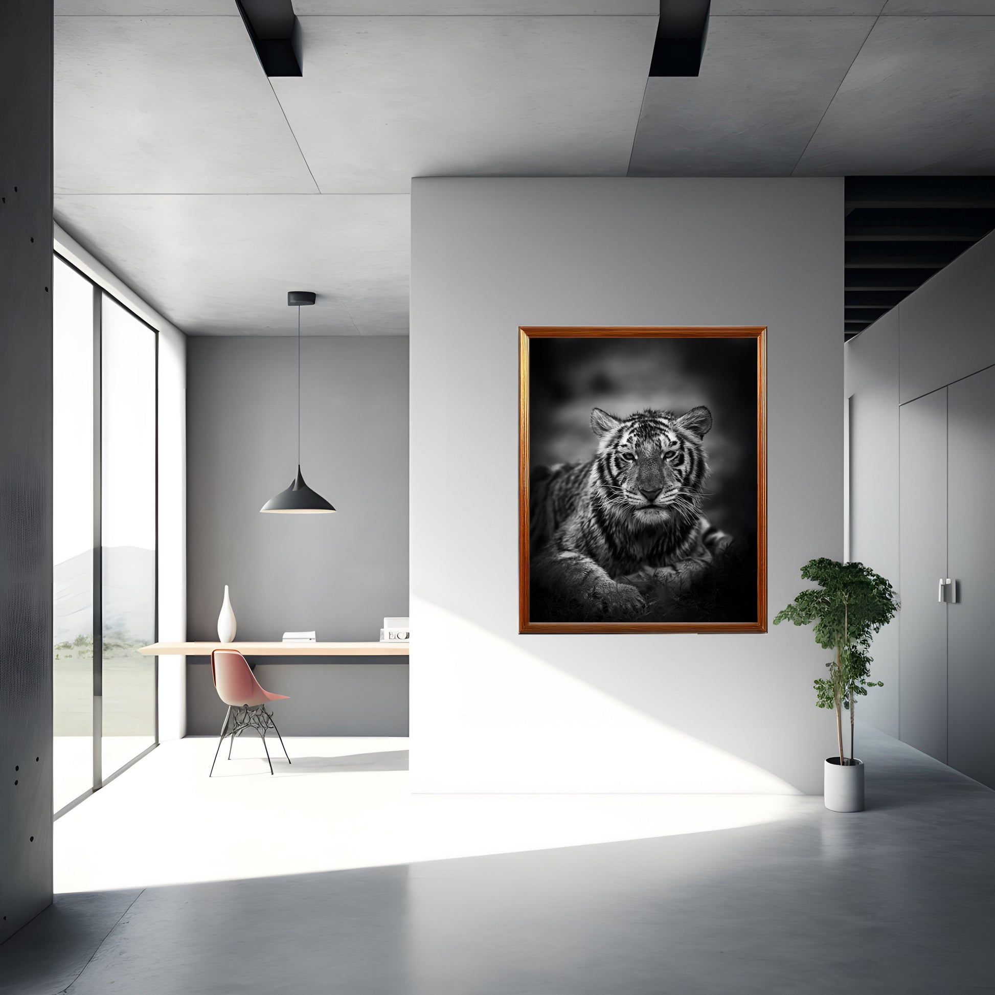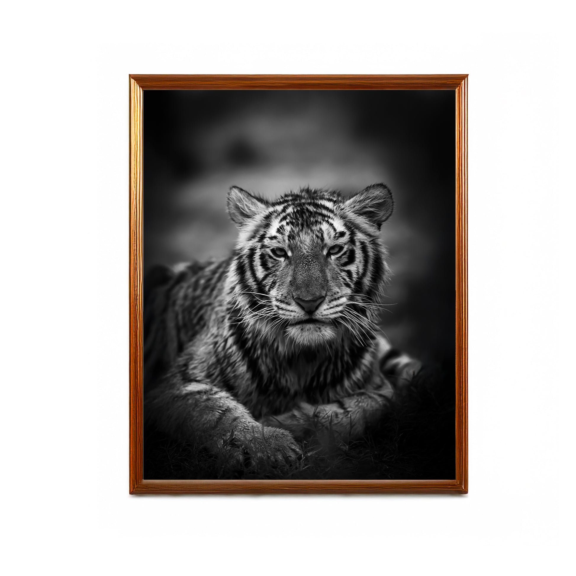 Embrace the raw power and majestic beauty of the tiger with this stunning black-and-white artwork. Capturing the intense gaze and detailed features of the tiger, this piece exudes strength, grace, and the untamed spirit of the wild. The monochrome tones bring out every intricate detail—from the sharpness of its eyes to the texture of its fur—creating a striking, timeless piece of art. Perfect for wildlife lovers or anyone looking to add bold, powerful energy to their space.