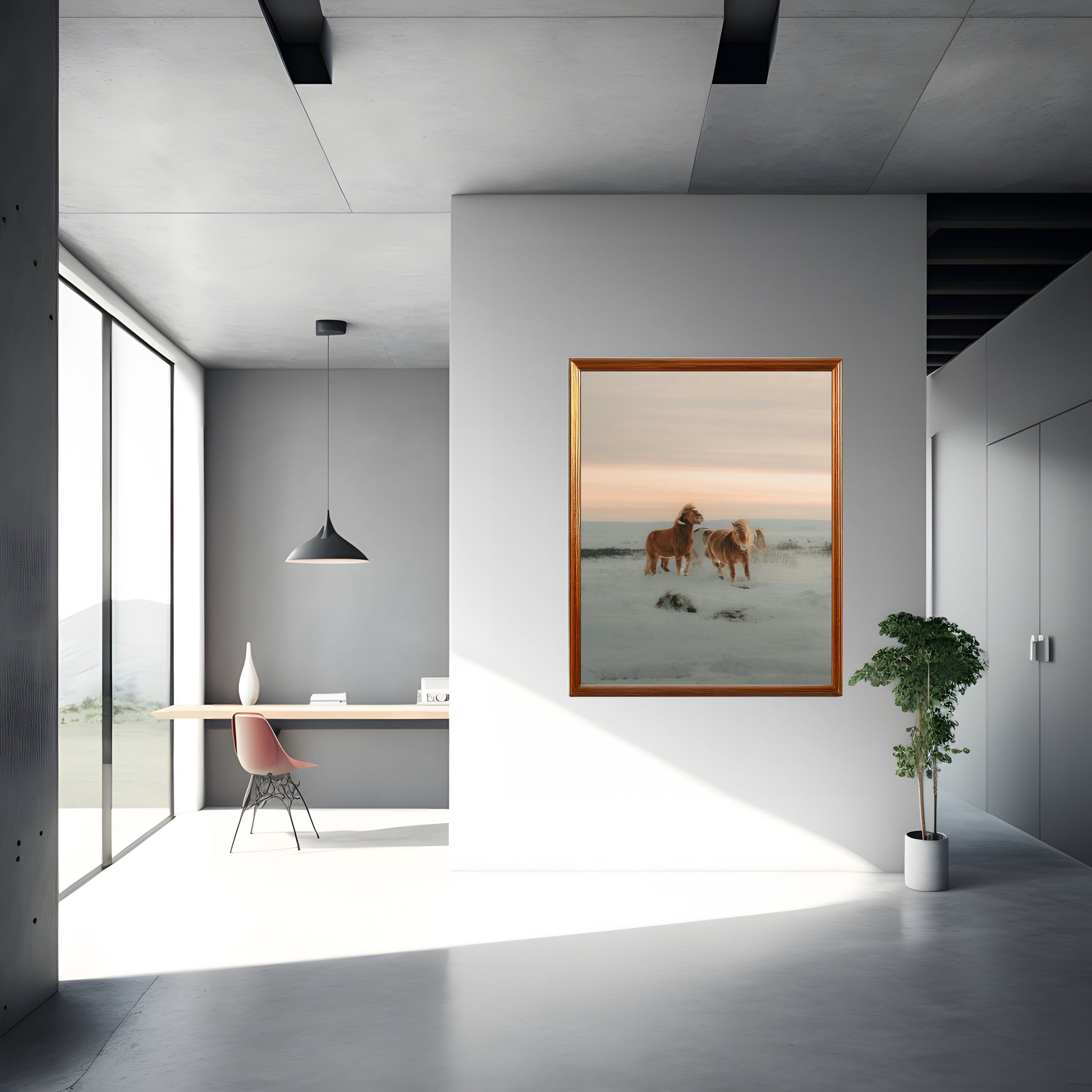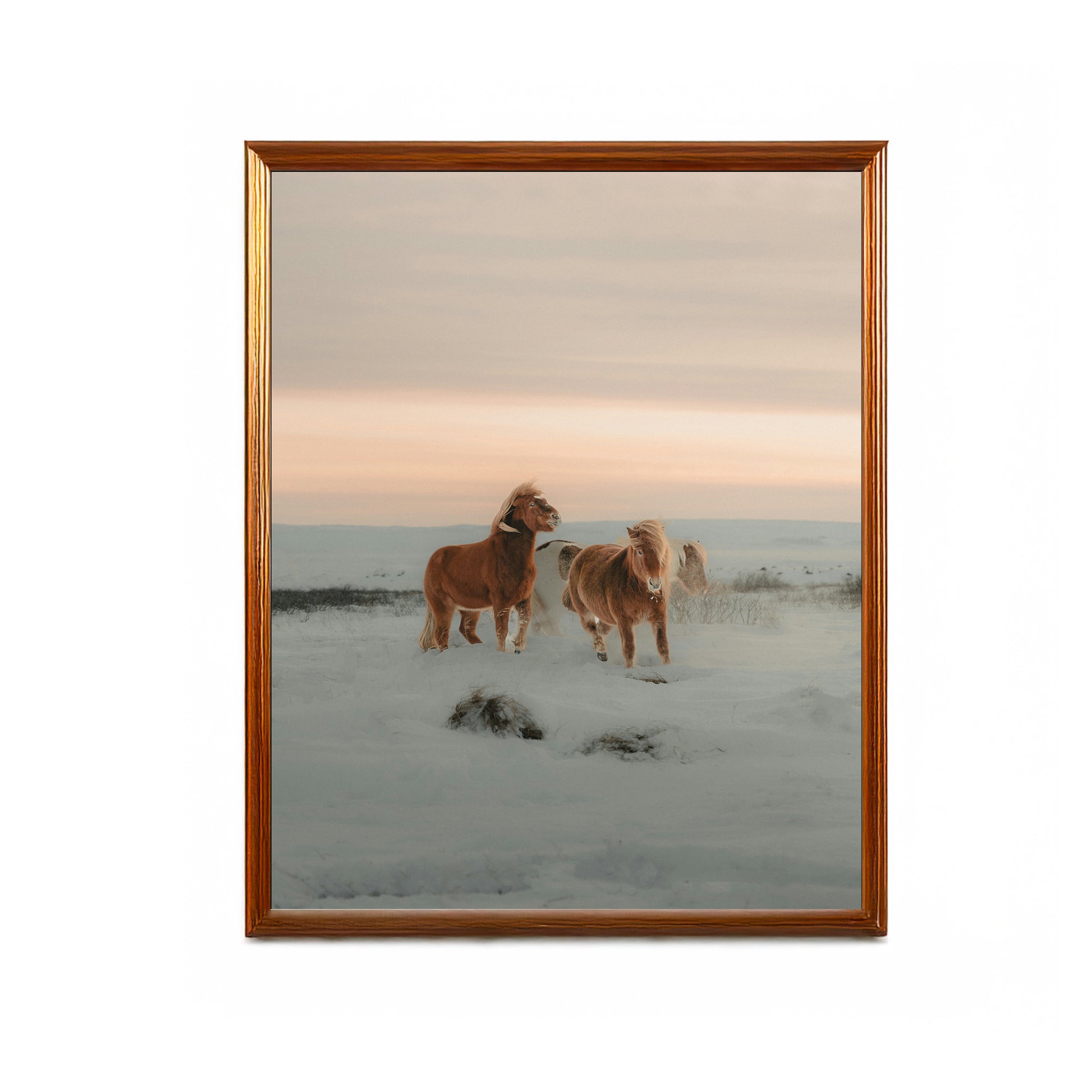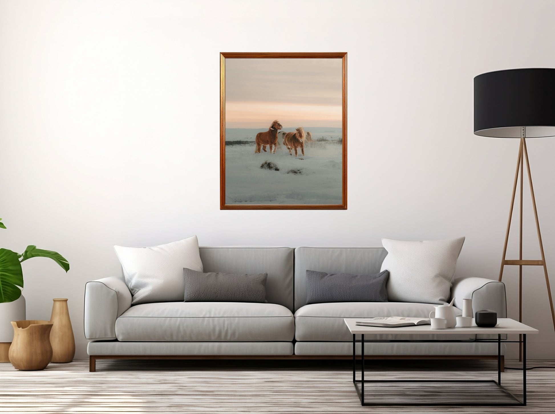 Capture the raw energy and untamed spirit of nature with this stunning artwork featuring two wild horses in playful motion. Watch as these magnificent creatures gallop freely, their flowing manes and tails dancing in the wind. The scene beautifully showcases the strength, grace, and bond between the horses as they embrace the freedom of the open field. This piece brings the wild, exhilarating essence of nature into your space, perfect for those who admire the beauty of untamed wildlife.